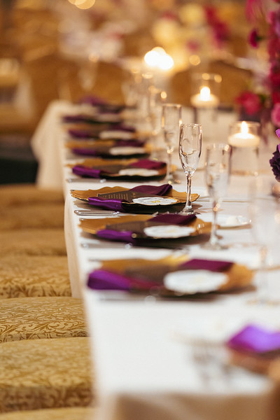 So, I went to work on a design that was vibrant, unique and fitting for them as a couple. Initially, I wasn’t sure exactly what pop of color to infuse at the reception until I received a picture of the Lehenga that she would wear during the reception – it was the most beautiful mix of purple and magenta! I also received the monogram that was designed for them as well. After finding the perfect purple satin napkin, a lightbulb came on and I instantly knew the direction I wanted to go – Watercolor Circles!